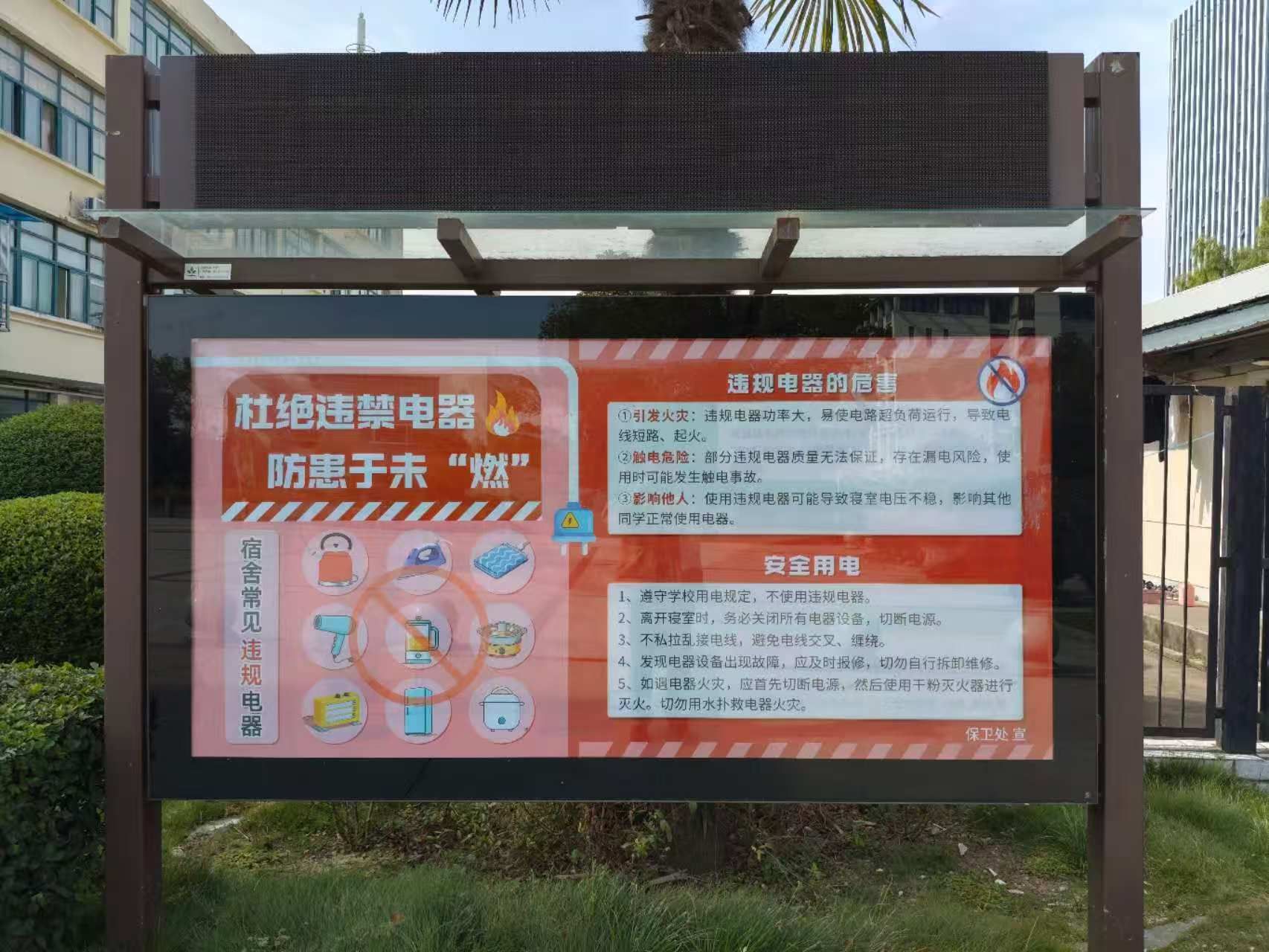 在宣传方面,学校充分利用校园电子屏、宣传栏、橱窗等线下阵地,张贴消防安全海报,滚动播放宣传标语,积极营造“人人关心消防、人人参与消防”的浓厚氛围,广泛普及用火用电安全知识。保卫处还利用无人智能巡逻车在锦绣校区“一站式”学生社区周边循环滚动播放消防主题宣传片,利用高科技设备将消防安全教育的触角延伸到学生集中的每一个角落。